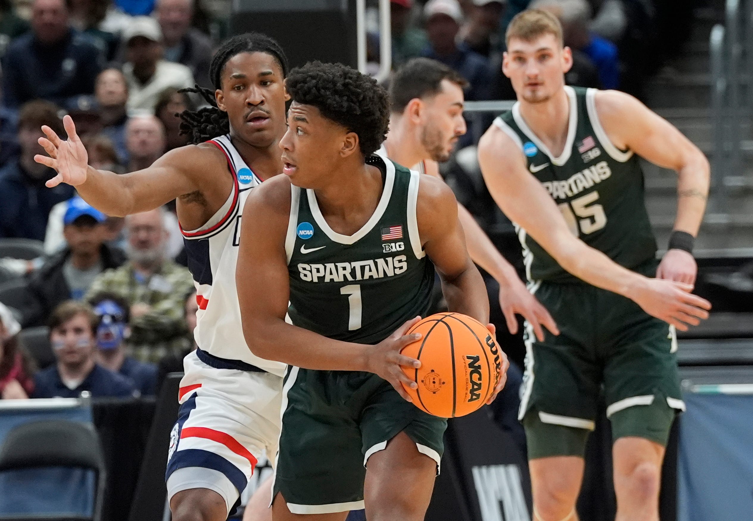 After Reed drew Cooper’s second foul with a nifty post-up spin move with 3:09 left before intermission, the former Michigan big man missed the free throw. At the other end, Fears accepted a pick from Kohler, then fed his forward on the pop for MSU’s first 3-pointer after six early misses. Then Jordan Scott drove and hit a cutting Carr for another layup. UConn started to flub up, and Kohler hit a pair of free throws with 1:26 left.