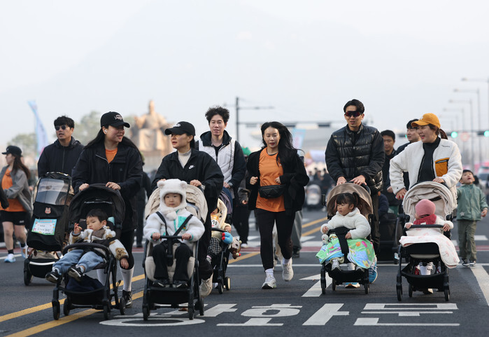 Parents push strollers carrying their children during the 2026 Seoul Stroller Run at Gwanghwamun Square in central Seoul on March 28, 2026. (Yonhap)