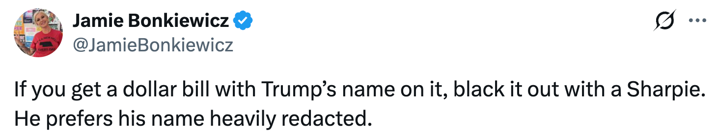 Of all the ideas, there's one that feels most fitting: "If you get a dollar bill with Trump’s name on it," someone wrote, "black it out with a Sharpie. He prefers his name heavily redacted."