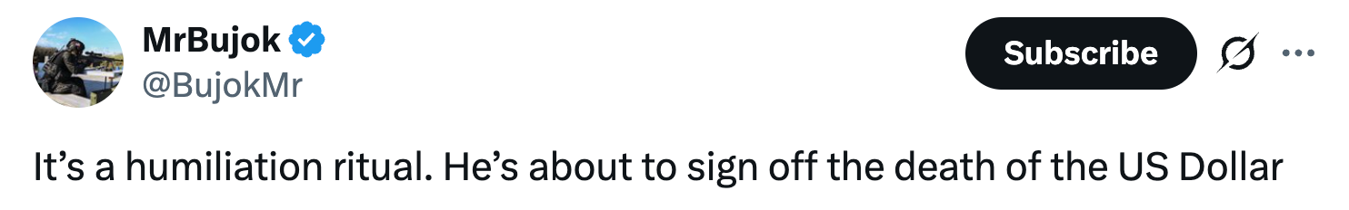 "It's a humiliation ritual," one person wrote. "He's about to sign off the death of the US dollar."