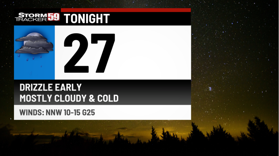 Tonight features light showers before midnight with otherwise mostly cloudy skies. We will see a slow clearing trend take place after midnight. A northwest wind that will be breezy at times will usher in much colder temperatures overnight with lows in the mid 20s. Wind gusts up to 25 mph are expected.