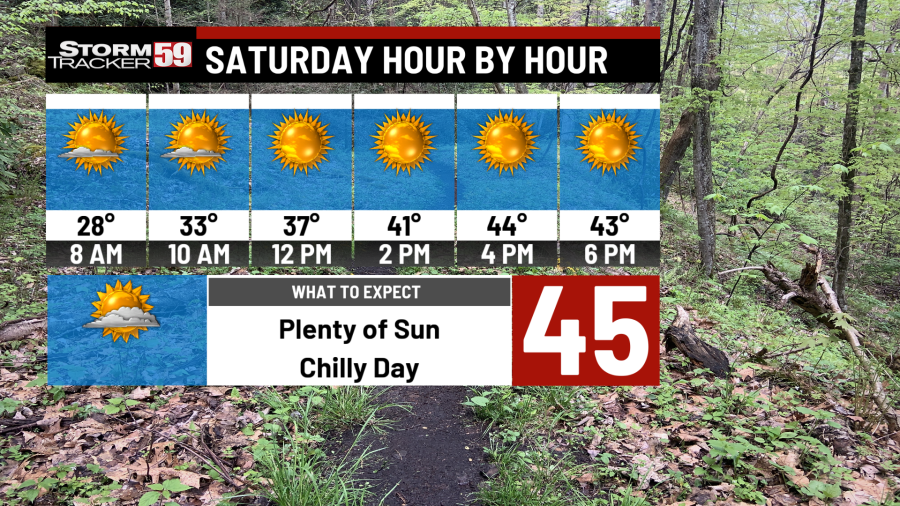 Saturday provides a few clouds in the morning, but we will see gradual clearing continuing throughout the morning and into the afternoon with mostly sunny skies expected. Despite the sunshine, it’s not much of a warmup expected with a north breeze in place as we’ll see high temperatures in the low to mid 40s.