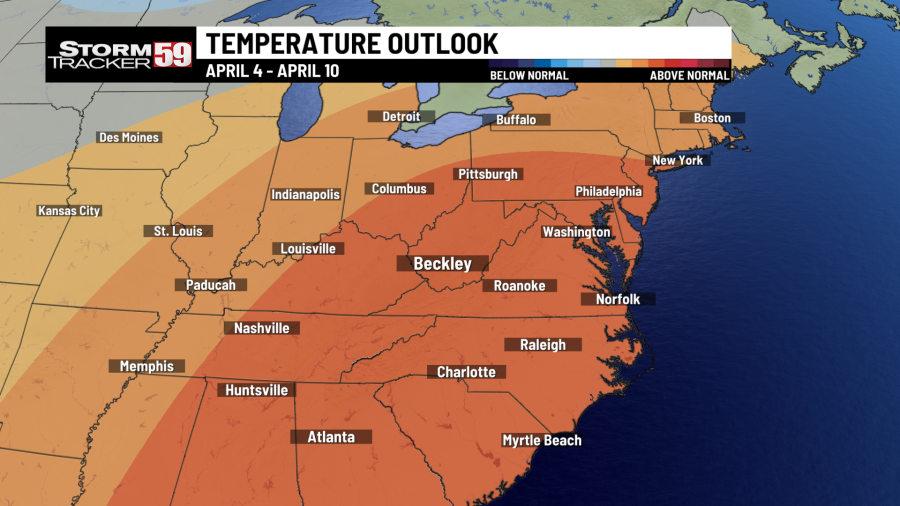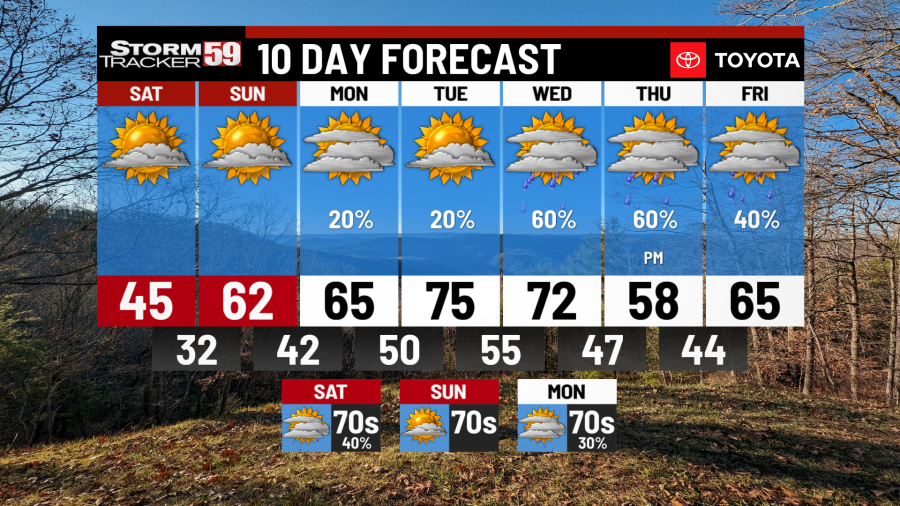 Sunday features more sunshine and warmer temperatures as high pressure moves due east of the region. That will get the southerly breeze kicking well and push high temperatures up into the low to mid 60s along and west of the turnpike/US-19 corridor, with 50s farther east into the Greenbrier Valley.