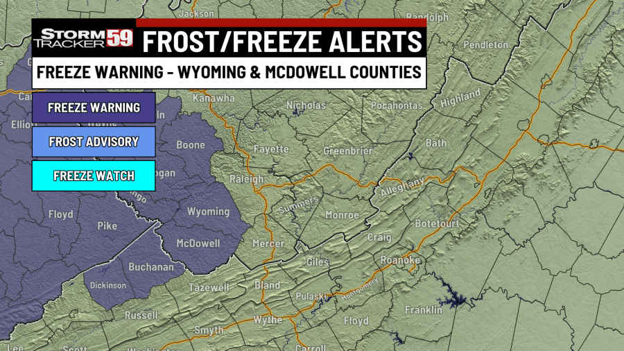 - FREEZE WARNING for Wyoming and McDowell counties from midnight to 10 AM Saturday and also from Saturday night through Sunday morning. Temperatures expected to drop below freezing during both overnight timeframes could kill crops or other sensitive vegetation.